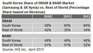 SEOUL, KOREA – Market research firm IHS pointed out that South Korea is crucial to global electronics markets because of its dominance in producing 66% of all DRAM, 48% of all NAND flash memory chips and 70 % of all tablet displays.